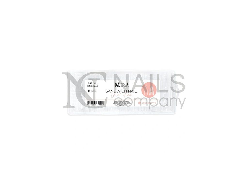 S dvojitou formou Sandwich začnete pracovat stejně jako s jakýmkoli jiným designem nehtů – připravíte si nehtovou ploténku, nanesete produkty a podkladový lak. Vyberete vhodnou velikost formy tak, aby dokonale seděla na nehtu. Poté umístíte spodní formu pod nehet pomocí podkladového laku Repair, nanesete gel nebo akrylový gel a vše zafixujete horní formu, lehce přitlačíte – hmota se rovnoměrně rozprostře a vytvoří hladký povrch. Vytvrdněte v lampě, poté opatrně odstraňte formy a dle potřeby dolaďte tvar. Nakonec naneste barvu nebo vrchní lak – vzhled je hotový.